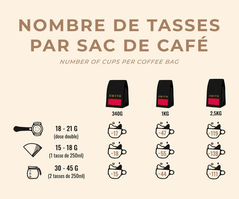 Pour préserver la fraîcheur de votre café Smith, nous vous recommandons de le conserver dans son sac d'origine qui est hermétique, épais et opaque (sinon dans un contenant similaire) à un endroit à l'abri de la lumière et de l'humidité. Dans ces conditions, votre café Smith peut garder sa fraîcheur jusqu'à 3 mois.